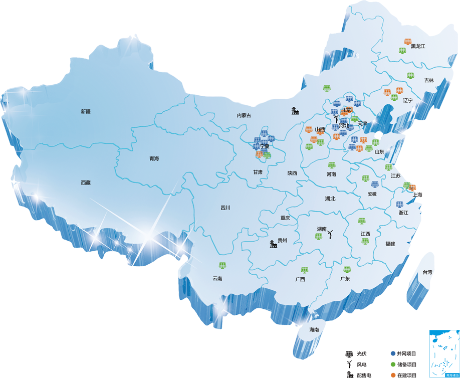 新能源坚持“以总部为管理与服务平台,以区域公司(分公司)为业务支撑,以项目公司(光伏电站)为运营单元”的三级组织架构,积极拓展光伏电站业务。自成立至今,已在全国 10 多个省市筛选储备光伏项目近3GW,其中已并网容量近 700MW。同时,分布式光伏和风电业务不断拓展,多能互补、配电网、微电网、售电等业务稳步推进,公司业务呈现出“风光领跑,多元协调”的态势。